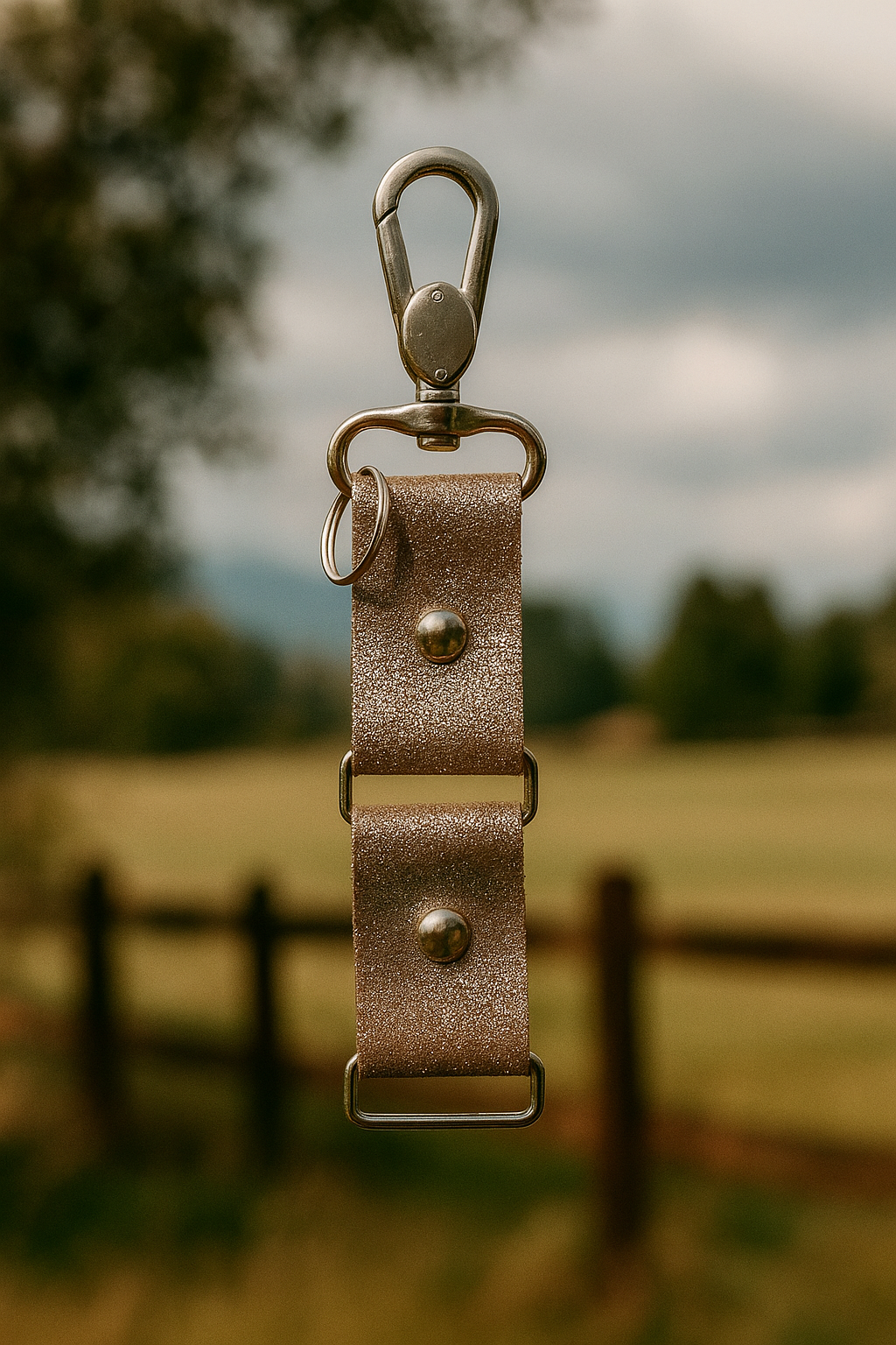 Llavero de cuero, hecho a mano con herrajes metálicos resistentes.